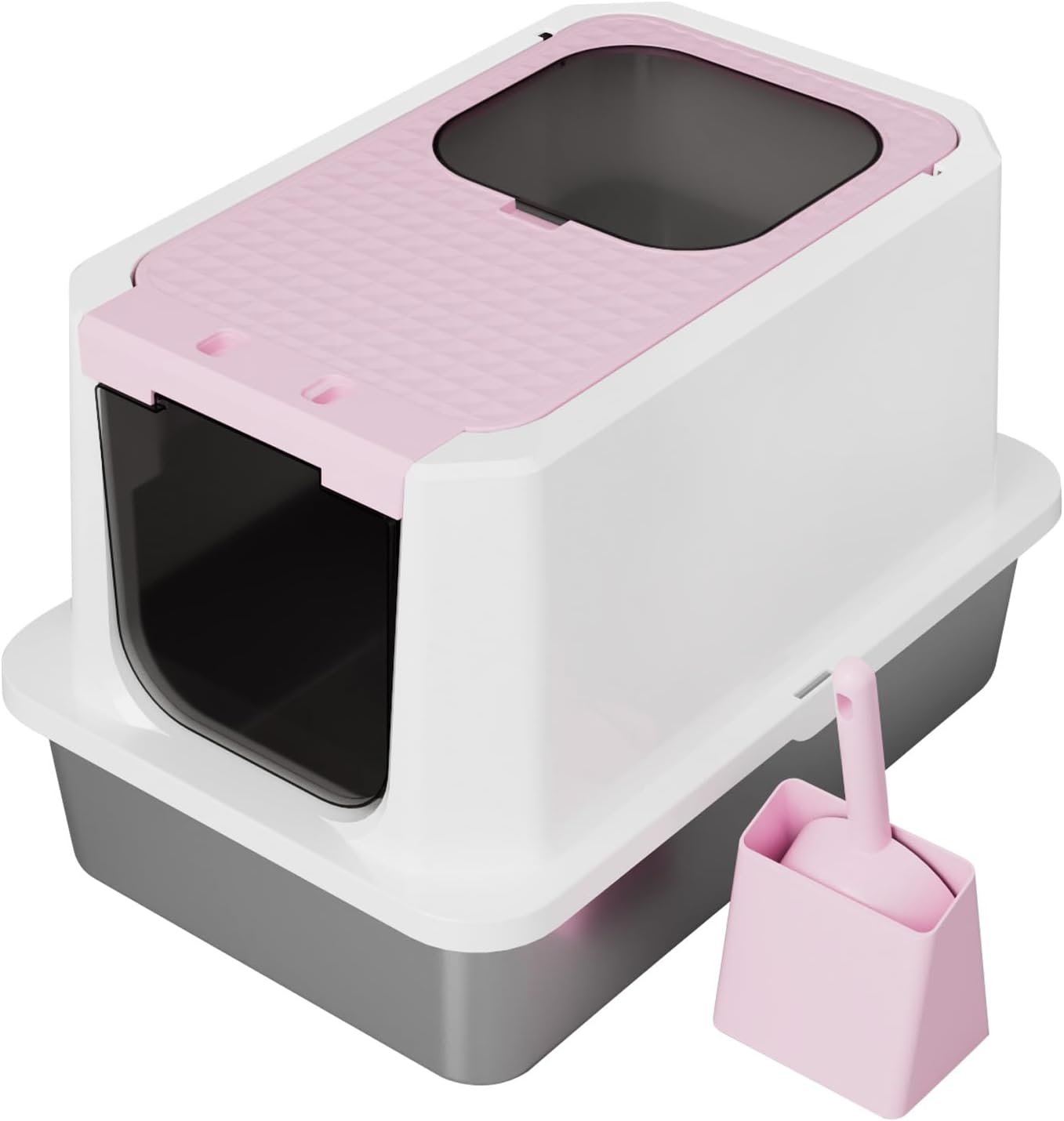 - Stainless Steel Basin: The basin is made of stainless steel with GRS certification, which is rust-free, odorless, sturdy and durable for long-term use. Compared with plastic litter boxes, the stainless steel material is less likely to make litter stick to the bottom; litter slides off the smooth surface, bringing convenience for cleaning the litter box.