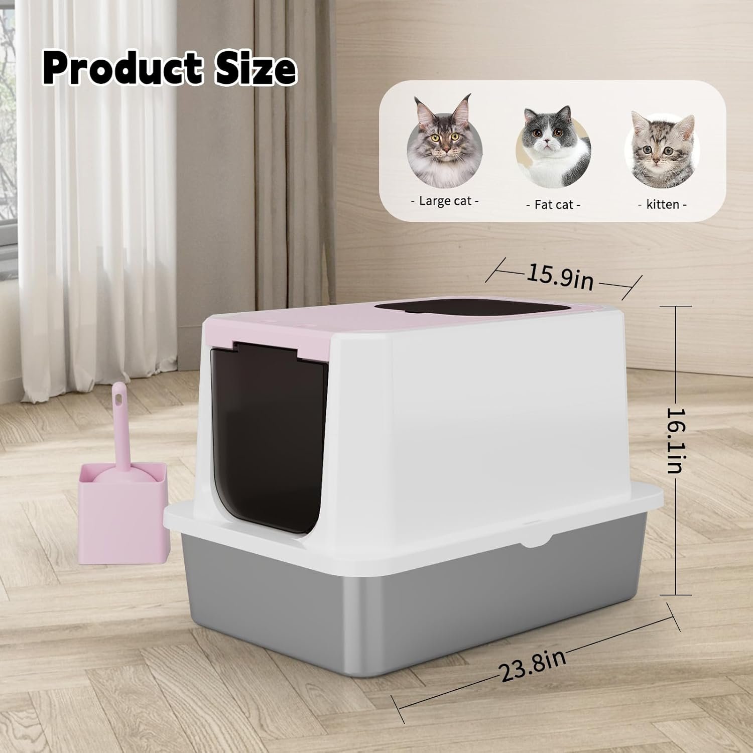 - Large Capacity: The inside of the litter box is roomy for cats of all sizes. The added space allows for ease of movement, with cats being able to turn around and toilet freely. Enclosed litter boxes provide cats with more privacy and help reduce the spread of odors.
